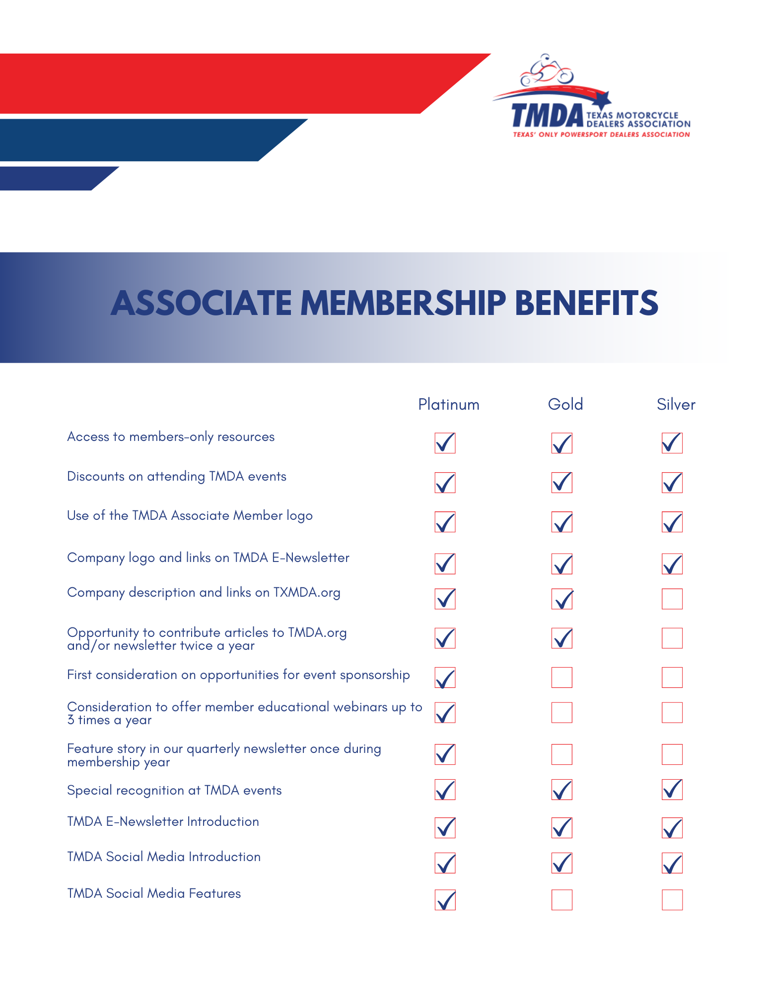 Membership in the Texas Motorcycle Dealers Association is an investment in your business and in this industry. TMDA exists to help our members increase sales, reduce expenses and improve profitability.
